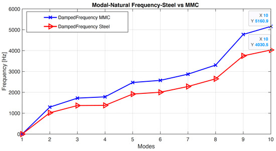 The modal analysis results were interpreted for both the MMC and alloy steel materials, and the initial data was recorded. The modal simulation was conducted for 10 different shape modes, and the maximum modal displacements were plotted.