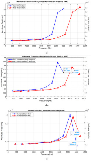 The harmonic simulation with preloaded external force yielded analytical comparisons between the two materials. The frequency response results, including the normal stress response, elastic strain response, deformation, and phase angle amplitudes, were recorded for both steel and MMC materials.