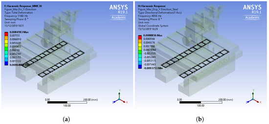 At this stage, the application of harmonic analysis to determine the stiffness and damping response of the system will be discussed. Sinusoidal actuation will be applied to the model, allowing the calculation of steady-state responses at different frequencies along the Z-axis of the linear structure. These responses will be used to generate graphs depicting the maximum displacement, stress, and strain of the structure over time. Interpreting these frequency responses will provide insights into the structural stiffness and damping under loaded conditions. For this simulation, a capacity load of 6500 N was applied to the top face of the Z-axis, while the bottom face of the base was fixed. Comparative models were created for the MMC and structural steel materials, and differentiation graphs were generated. The frequency ranges for the harmonic simulation were determined based on the modal analysis results. Frequency ranges of 0–4030 Hz for steel and 0–5160 Hz for MMC were set to ensure accurate solutions during the simulation. It is assumed that these frequencies, which were already calculated as natural frequencies, will interact with the harmonic phenomenon to determine the final response of the system.