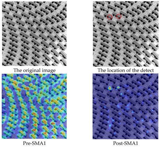 To validate the effectiveness of the proposed SMA module, we utilized the Grad-CAM algorithm [23] to visualize the network after training the YOLO-CSS model for 500 epochs. The results are shown in Figure 6. A random X-ray image with wire bonding defects was selected, and the feature maps before and after the two SMA modules in the network were visualized for comparison. In this case, SMA1 represents the feature map. Before entering the SMA1 module, the network’s feature extraction was chaotic and did not focus on the defect locations. After passing through the SMA1 module, the weights of features in other non-defect regions are suppressed due to adaptive weighting, while the weights of the defect locations are enhanced. Before entering the second SMA module (SMA2), the network has a deeper depth, allowing it to express higher-level semantic information. Therefore, the feature visualization results here are much better than those before entering the SMA1 module. After going through the SMA2 module, the network’s focus area can correctly identify the wire bonding defect locations. From this, we can conclude that the proposed SMA module in this paper has excellent feature extraction capabilities and can adaptively adjust the weights of different scales.