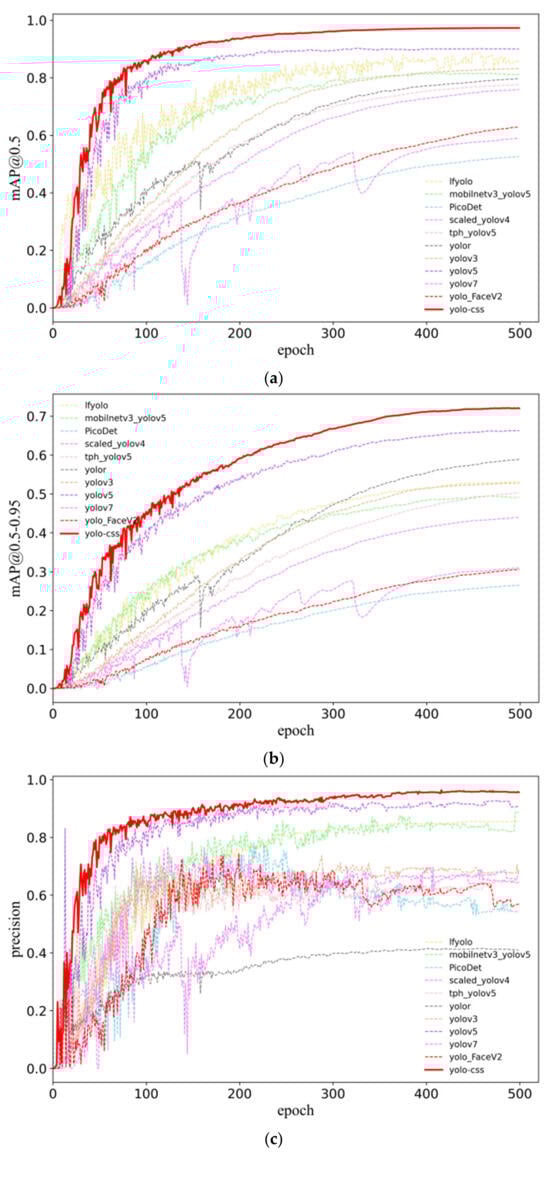 As shown in Figure 7, the performance trends of mAP 0.5, mAP 0.5–0.95, precision, and recall during the training process are depicted. From the figure, it can be observed that YOLO-CSS (represented by the red curve) exhibits faster convergence and overall smaller fluctuations, indicating its stability. Given that the detected lead bonding defects only occupy a small portion of the entire image, this suggests that our method is more accurate in extracting features for small objects and is more suitable for small object detection. In Figure 7c, it can be observed that the accuracy of YOLO-FaceV2 reaches its peak at approximately 180 epochs and gradually decreases thereafter. Yolor’s accuracy remains around 40% and does not show an increasing trend after 100 epochs. On the other hand, our method demonstrates consistent performance, experiencing a rapid increase in accuracy before the first 100 epochs and then maintaining a slight upward trend, eventually converging at around 95%. This further analysis indicates that our method outperforms the other algorithms.