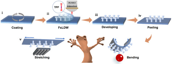 In contrast, more elegant approaches involve stretching and bending the adhesive mechanically, closely resembling the natural gecko’s switching mechanism, where adhesion switching is accompanied by footpad stretching and bending [46,47]. A flexible substrate is crucial for implementing such adhesion mechanisms. Traditional gecko-inspired adhesives obtained through replica molding limit structures to 2.5D, resulting in constrained adhesion strength and applicability [48]. Femtosecond laser direct writing (FsLDW) enables the fabrication of complex three-dimensional structures, yet few soft materials have been explored, and their adhesion performance on flexible substrates remains unexplored [33].