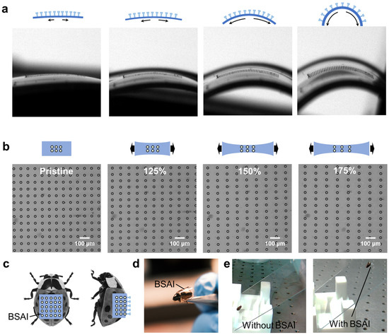 To further demonstrate the connection robustness of mushroom-shaped micropillars on flexible substrates, the BSAIs were secured onto a vernier caliper using a clamp. By manually adjusting the distance between the measuring jaws, the morphology of the flexible substrate could be precisely controlled, and thereby the pitch among micropillars on it. In detail, as the measuring jaws gradually close, the substrate can be bent upwards with increasing curvature, thereby increasing the pitch among the mushroom-shaped micropillars on it (Figure 3a). On the other hand, increasing the distance between the measuring jaws resulted in the stretching of the substrates. With the gradual stretching of the sample, the pitch among the micropillars exhibited a responsive increase as exhibited in Figure 3c. Even at a stretching strain of 175%, the micropillars remained adhered to the substrate without signs of collapse. These results indicate the remarkable mechanical robustness of the BASI during stretching and bending [60], which is of great importance in achieving adhesion functions in practical applications, especially in robotics interfaces. Taking the beetle’s dorsal surface as an example, the originally smooth surface was equipped with as-made adhesive, as shown in Figure 3c,d. On the inclined glass, the pristine beetle specimen quickly slips off (Figure 3e, left), whereas the one equipped with the flexible adhesive can adhere steadily (Figure 3e, right). In the future, equipping BSAI with controllable soft robots rather than specimens is envisioned to achieve cross-species functionalities.