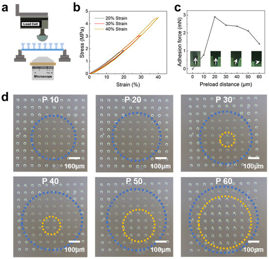 Force characterizations in non-stretched BSAIs. (a) Illustration of the custom adhesion platform. (b) Stress–strain curves of a single micropillar on the flexible substrate. (c) Adhesion values of the non-stretched samples under different preloads and the corresponding morphologies of the micropillars. (d) The evolutions of the corresponding contact signatures of the non-stretched samples under different preloads. The regions enclosed by the blue dashed line represent the efficient contact areas, while the regions enclosed by the yellow dashed line indicate the collapse areas of the BSAIs.