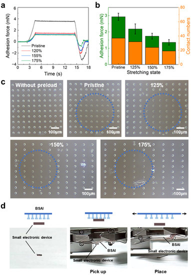 Next, the adhesion forces of BSAIs were measured under different stretching strains, as shown in Figure 5a. At a stretching strain of 175%, the adhesion force was reduced to 1.36 mN (Figure 5b), which is significantly lower than the adhesion force of non-stretched BSAI. The underlying mechanism for this reduction was again revealed by in situ microscope observation, as shown in Figure 5c. As the sample was stretched, the number of micropillars within the region enclosed by the blue dashed line, in which the probe could establish contact, decreased gradually. The number of micropillars in efficient contact was quantified and is presented in Figure 5b, which exactly followed the same trend as the adhesion force. These results demonstrate that stretching BSAI leads to a gradual reduction in the number of micropillars in efficient contact with the target, thus influencing the magnitude of the adhesion force. Based on that, such BSAI enables the non-destructive transfer of fragile and thin objects. For instance, we demonstrated the process of picking up and placing a small electronic device (2.0 × 1.2 × 0.8 mm) by using BSAI, as exhibited in Figure 5d. This characteristic allows it to be potentially applied to non-destructive transfer printing of fragile and thin objects, such as LEDs [11] and other flexible electronics [63].