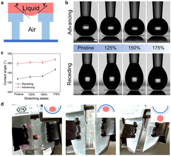 Wettability characterizations of the BSAIs. (a) Schematic of a water droplet suspended by the vertical component of surface tension. (b) Morphologies of the droplets on samples of different stretching strains. (c) Results of advancing and receding contact angles with related stretching strains. (d) Schematic and corresponding snapshots of picking up and releasing a dyed water droplet by the BSAI.