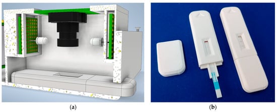 (a) Cross-section of the test image acquisition compartment; (b) holder cassettes designed to contain lateral flow test.