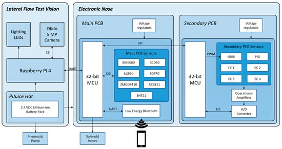 The E-nose contains an electronic circuit where the sensors are located, and a pneumatic circuit responsible for the distribution of gases to the sensors. The electronics have two printed circuit boards (PCB), which communicate via SPI bus and are placed parallel to each other and separated by a gas cell where the sensors are enclosed.