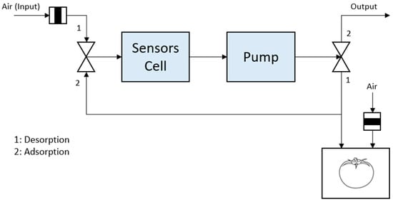 This diagram shows how the two solenoid valves are used to draw air in and out of the bag with a single pump. Both solenoid valves are synchronized and change state together. When the experiment is in the desorption phase, the clean air (or reference air) passes through an activated carbon filter and is introduced into the gas cell through the first solenoid valve. From there, it is sucked in by the pump and passes into the bag containing the tomato to fill it with fresh air. At the end of the desorption time, both solenoid valves switch simultaneously, and the gas now passes from the bag into the gas cell (it cannot return through the second solenoid valve). In the cell, it is sucked in again by the pump, and, this time, this air is expelled to the outside through the second solenoid valve. To prevent a vacuum from forming in the bag during this process, an external air inlet can be placed in the bag itself. In this case, it would be necessary to install another air filter to prevent unwanted odors from entering the bag.