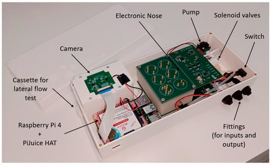 This entire system is embedded in a 3D-printed housing measuring 26.65 × 12 × 5.9 cm, which has a small hole to access the micro-USB connector of the PiJuice HAT, some fittings (to connect the bag with the tomatoes, the reference air inlet, and the gas outlet), the hole through which the cassette is inserted into the chamber housing, and a switch to turn the device on and off. The layout inside this housing is shown in Figure 4.