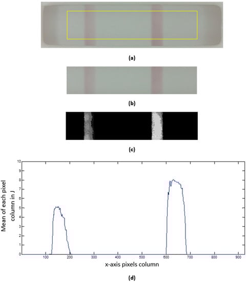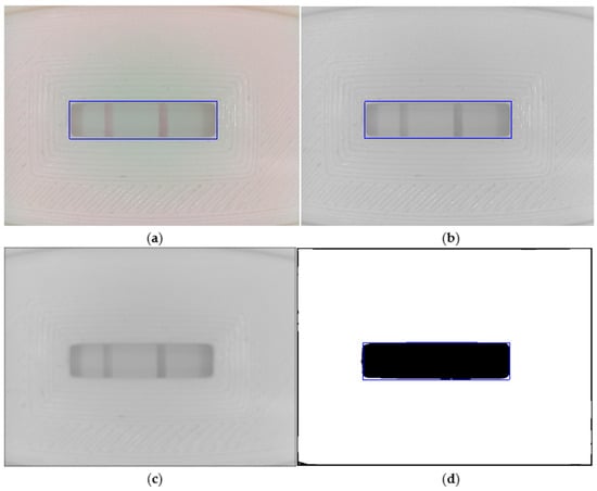 - Window location. As Figure 5d shows, the binarized image separates the test window area (in black) from the cassette. However, to safely locate the window sub-image, we first reconstruct the black border area, which is a product of the Gaussian filtering stage. Next, we compute the horizontal and vertical sum arrays from the reconstructed binary image. Finally, we select the window sub-image as those rows (columns) with horizontal (vertical) sum array values less than the mean value of that array. The resulting test window sub-image (1294 × 330 px) is shown in Figure 5a–d as a blue rectangle overlaid on each image.