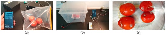 (II) In the second test (Figure 7b), the three tomatoes from the first trial were incised to accelerate deterioration. They were placed in a rigid plastic container of about 15 L for three days. The container had an air inlet hole and another for sample collection. The two tomatoes were placed inside the container for three days and 10 measurements were taken per day with 1-hour intervals between each measurement.