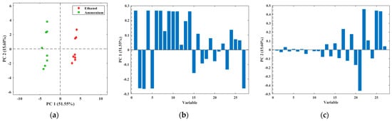 (a) PCA of the measurements of 5% ethanol and 5% ammonia solutions; (b) PCA loading plot for PC1; (c) PCA loading plot for PC2.