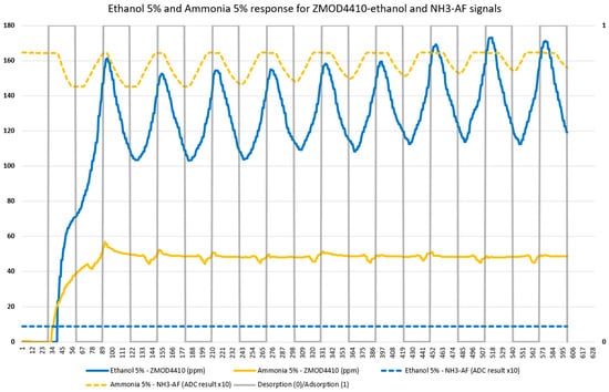 The difference observed in the results between the two compounds is because the sensors react differently to both compounds. In addition, there is a specific electrochemical sensor for ammonia (NH3-AF) that responds to this compound and does not react to others, such as ethanol. There are also MOS sensors that give ethanol signals (SGP30 and ZMOD4410) that are different for both compounds. Figure 9 shows the ethanol signal from the ZMOD4410 sensor and the NH3-AF sensor signal for the two compounds. The blue lines correspond to the 5% ethanol measurements and the yellow lines correspond to the 5% ammonia measurements. The continuous lines belong to the ZMOD4410 sensor and the dashed lines belong to the NH3-AF sensor. The gray line indicates 0 when the nose is in the desorption phase and 1 when it is in the adsorption phase (secondary axis on the right).