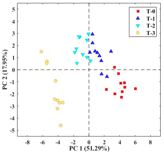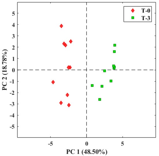 E-nose analysis of tomatoes placed in bags at 25 °C. T-0: tomato on day zero; T-3: tomato on day three.