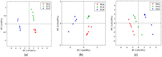 The information obtained from the E-nose presents multiple variables, one for each sensor. To interpret them, it is necessary to reduce them as much as possible. For this, PCA was used [67,68,69]. In the first test analyzing tomatoes in airtight bags, the PCA based on the first two components was able to differentiate between the olfactory pattern of healthy tomatoes analyzed in bags at day zero (stage 4 of maturity) and after three days of ripening (stages 5–6 of maturity) (Figure 10).