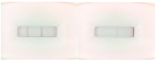 As for the vision part of the lateral flow strips, a Raspberry Pi 4 Model B with 2 GB of RAM and the Raspberry Pi OS version 11 (Bullseye) operating system was used. This Raspberry is powered by the PiJuice HAT, a portable uninterruptible power supply platform from the company Pi Supply (Nebra Ltd., Bells Yew Green, UK), which allows the Raspberry Pi 4 to be powered by a battery instead of an external AC adapter. The PiJuice HAT is powered by a 3.7 VDC, 1820 mAh Li-Po battery, although it contains a connector that allows installing higher-capacity batteries, from 5000 to 12,000 mAh. The PiJuice HAT has a B-type micro-USB connector, to which a smartphone charger can be connected to recharge the battery. This battery also powers the E-nose and the pneumatic pump, as the PiJuice HAT has 3.3 VDC and 5 VDC outputs. The OKdo 5 MP Camera, from OKdo Ltd. (London, UK), was used to take the photos. It has a 5 MPx sensor that provides color images of 2592 × 1944 px, with an aspect ratio of 4:3, a fisheye lens with adjustable manual focus, and its software allows storing the images in the chosen compressed format—in this case, lossless PNG [63]. The camera is connected to the main board via a flat cable connector to the Raspberry Pi 4’s CSI connector, allowing the Raspberry processor to access various functions of the camera, such as brightness and contrast control, as well as white balance and exposure time, and to perform the capture in a controlled manner. This camera was mounted on the device developed in this work with a focal length of 20 mm, placing the sensor vertically on the cassette. In order to control the illumination, the capture set was completed with two white Nichia Corporation (Tokushima, Japan) LEDs located on either side of the camera sensor at about 20 mm. As shown in Figure 1a, this system allows adequate illumination of the cassette, avoiding the projection of shadows on the strip, except those at its lateral ends, produced by the edges of the cassette window.