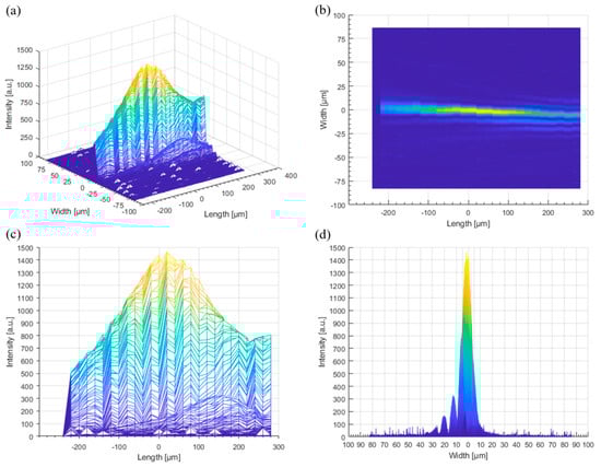 In this study, we adopted a Bessel beam to enhance productivity. The depth of focus of a Bessel beam is large and can exceed the glass thickness. Hence, a single pulse of a Bessel beam can generate a full-thickness local modification of a glass. A schematic of the experimental setup for the local modification using an ultrashort-pulsed laser with a Bessel beam is shown in Figure 1a. A diode-pumped Yb:KGW ultrashort-pulse laser (Pharos, Vilnius, Lithuania, PH1–20, Light Conversion, center wavelength of 1030 nm) was used as the light source. It can generate burst-mode pulses of 25 pulses with a 213 ps interval and 9 pulses with a 10 ns interval. As the number of pulses increased, the energy of each pulse decreased. Because at least 30 µJ of pulse energy is required to generate local modifications, we could only use double pulses in this study. The pulse repetition rate was set to 100 Hz and synchronized with the motion stage (M-414.2PD, C-863.11, Physik Instruments, Karlsruhe, Germany). The speed of the stage was set to 10 mm/s. Hence, the distance between the local modifications was 100 μm. To investigate the effect of the pulse duration, it is changed from 0.2 to 1 picosecond (ps) with a 0.2 ps increment. As aforementioned, a pulse energy of at least 30 µJ is required for generating local modification in our experimental set up. Thus, for a fair comparison between each case, we set the pulse energy as 100 µJ. Hence, a pulse energy of 200 µJ (100 µJ + 100 µJ) was radiated from the laser. However, a considerable reduction in the pulse energy occurred at the spatial light modulator (LCOS-SLM, X10468-03, Hamamatsu Photonics, Shizuoka, Japan). The pulse energy at the glass surface was measured and calculated using a power meter (Nova II with a 30A-BB-18 sensor; Ophir, Jerusalem, Israel). Only 34% of the pulse energy reached the glass surface. In other words, the irradiated pulse energy on the glass was 68 µJ (34 µJ + 34 µJ). Beam shaping from Gaussian to Bessel involves two steps: first, a Gaussian beam is transformed into a donut beam using the LCOS-SLM. To transform the beam shape, a phase image is applied to the LCOS-SLM. In this study, the phase images were generated using an optical engineering program (VirtualLab Fusion; LightTrans, Jena, Germany) (Figure 1b). In our experimental setup, 64 phase levels were sufficient to generate a donut-shaped beam. Further, a Bessel beam was formed and measured using a beam profiler (FM100-YAG1064-50x; Metrolux, Berlin, Germany). Here, the widths of the Bessel beam were 5.8 μm (FWHM) and length 180 μm (Figure 2). As the glass thickness was 100 μm, 180 μm was enough to generate full thickness local modifications in the glass.
