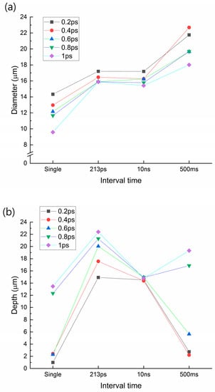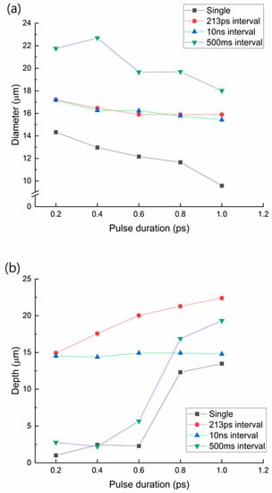 TGV (a) diameter and (b) depth of each case. This includes the pulse duration from 0.2 to 1 ps and a pulse-to-pulse time interval from a single pulse to the 500 ms interval.