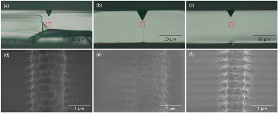 To explore the difference between the two cases in detail, we observed the cross section of the glass. Using an optical microscope, we observed the dark line caused by a Bessel beam. However, this was not observed using SEM. Thus, we can conclude that there is a change in density along the local modification line. To verify this, glass was dipped in a diluted HF solution. Then, 10 mL of 12.25% HF solution was added. The glass was then immersed in the solution for 30 s. Figure 5 shows the result. Figure 5a–c show the optical microscopy images after etching with 8 mol/L KOH. In these images, dark lines can be clearly observed. Figure 5d–f show the SEM images after an additional 12.25% HF etching. These nanostructures can be clearly observed. Figure 5a,d are the case of the single Bessel beam. In this case, a periodic nanostructure is formed. The period is 346 ± 14 nm, which is equivalent to the following equation: , where p is the period of the nanostructure, λ is the wavelength of the laser (1030 nm), and n is the refractive index of the material (1.5123 ± 0.0015). Figure 5b,e show the case of a double pulse with 213 ps intervals. In this case, the nanograting was periodically formed. Its period and thickness of nanograting were 328 ± 27 and 156 ± 22 nm, respectively. (Figure 6) Nanograting was also formed in the case of a double pulse with 10 ns intervals (Figure 5c,f). Its period and thickness were 339 ± 27 and 231 ± 31 nm, respectively. Hence, we can conclude that generating thinner nanograting enhanced the etching rate. Additionally, in the case of a 10 ns interval, we can observe a trace of melting on the nanograting. Hence, they may have experienced the heat. Meanwhile, for a 213 ps interval, we only observed the nanograting. As such, we can claim that adding more energy to the carrier excitation time regime is more efficient for generating TGV.