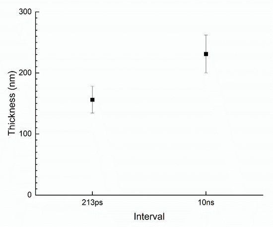 In addition, the etching depth was increased by increasing the pulse duration for the single, 213 ps interval case, and 500 ms interval cases. However, for 10 ns cases, the etching depth was almost constant. We think that this result supports the aforementioned hypothesis. For the 213 ps interval cases, with an increasing pulse duration, the optical penetration depth of photons also increased because the electrons were in excited states and they were diffused to beam the propagation direction. Meanwhile, for 10 ns cases, most electrons went back to the ground state. However, phonon and heat diffusion occurred. Because the thermal diffusion length was not significantly varied, the etching depth was similar in this case.