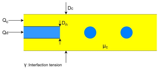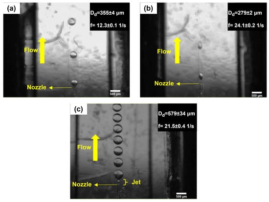 Three regimes are presented in the co-flow droplet-generation method, i.e., dripping (Figure 1a), narrow jetting (Figure 1b), and wide jetting (Figure 1c). In the jetting regimes, there is a jet between the capillary tip and droplet. Polydispersity in the jetting regimes is high because of the perturbations moving along the jet interface [51]. The dripping regime occurs at low C-phase viscous and D-phase inertial forces. This regime has no jet, and the instability is absolute [10]. Perturbations progress downstream and upstream [56,57]. In this kind of instability, perturbations coming from the system give rise to monodispersed droplets in the dripping regime (polydispersity < 3% [58]). For this reason, we attempted to generate droplets in the dripping regime in this paper.