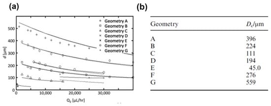 Co-flow droplet generation in devices with various channel sizes [54]. (a) Effect of C-phase flow rate on droplet size in eight devices (Geometry A–G), with (b) channel sizes ranging from 45 to 559 µm. Reproduced from Ref. [54], with permission from the Royal Society of Chemistry.