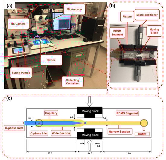 Co-flow droplet-generation device and experimental setup. (a) The experimental setup consisted of the developed device, a high-speed camera, a microscope, and two syringe pumps. (b) The device comprised a PDMS segment, two glass slides bonded to the top and the bottom of the PDMS segment, a fixture, two micro-positioners, and two moving blocks. The moving blocks were used to squeeze the channel through the micro-positioners. (c) A 2D drawing of the PDMS segment with a D-phase glass capillary inserted through a groove into the C-phase channel. Dimensions are in mm.
