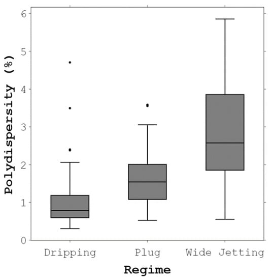 Polydispersity is defined as the ratio of the standard deviation of droplet diameter to the mean diameter of the droplet population. Figure 7 shows the box plot of polydispersity for the regimes observed in this study. In the dripping regime, the perturbations from the system occur at a fixed location. Because of this, the median of polydispersity in the dripping regime was less than 1%. However, some outliers may be due to experimental disturbances. The monodispersity of droplets in the dripping regime is consistent with the literature [52,56]. There was a slight increase in the polydispersity of droplets in the plug regime. This increase may result from the instabilities that originated from the walls. Droplets generated in the transition regime to the wide jetting regime were less uniform. The existence of a jet alongside random noises led to a higher polydispersity. Polydispersity is likely to increase with a further increase in Wed because the system will operate solely in the wide jetting regime.