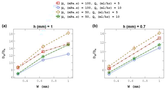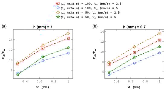 C-phase flow rate (Qc) was kept constant while the channel was squeezed to generate droplets over a wide range. Figure 8 shows the effect of changing the channel width from 1 to 0.3 mm on droplet size using channels with h = 1 and 0.7 mm. As shown, decreasing the channel width substantially reduced droplet diameters, supporting the idea of using channel size though a flexible wall to control droplet size on demand. This method will facilitate the growth of the wall effect as defined above, in addition to an increase in C-phase velocity, giving rise to an increased viscous force causing droplet breakup. Moreover, the results in Figure 8 show that by increasing the C-phase viscosity (µc) and flow rate (Qc), at a constant channel width, droplet size decreases due to an increase in the shearing viscous force.