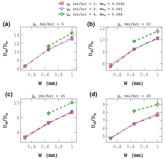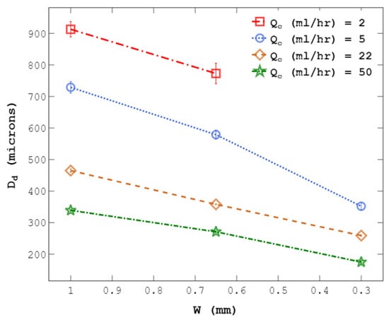 The effect of the D-phase flow rate (Qd) on droplet size at a fixed Qc was also investigated. Figure 11 shows the effect of channel width on droplet size for three levels of Qd. For all Qc values, when Qd doubled from 1 to 2 mL/h, the maximum change in droplet size was about 5%. This slight change was seen when Qd was lower than 2 mL/h, Wed < O(0.1), i.e., in the dripping regime [47]. In the dripping regime, Qd did not significantly alter the force balance between viscous and interfacial tension forces [59]. But when Qd increased to 4 mL/h, droplet sizes increased by 9–24%, depending on the value of Qc and w. Also, the average polydispersity increased from 1.3% to 2.9%. The reason for these changes was the transition to the wide jetting regime at Qd = 4 mL/h. The same behavior was observed by Shams et al. [52]. They showed that when Wed rose from 0.01 to 0.04, the maximum change in droplet size was about 11%, but when Wed increased to 1, the wide jetting regime was formed, and droplet sizes grew by about 34%. The results in this section support previous reports [47,50] on the weak effect of Qd on droplet size.