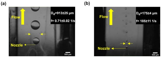 Microdroplets refer to micro-scale droplets of a target fluid (called a dispersed, or D-phase, fluid) in a suspension fluid (called a continuous, or C-phase, fluid), whose diverse applications have attracted attention [1,2,3]. Microdroplets provide significant advantages in sample processing and monitoring, such as facile automation, increasing practical flexibility, decreasing analysis time, and small volumes. Molecular synthesis [4], diagnostics [5,6], cell biology [7,8], chemical reactions [9], imaging [10,11,12], and food processing and production [13,14] applications have benefited from the use of microdroplets.