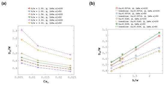 To find the appropriate functional relationship for Equation (3), Dd/w is plotted against each dimensionless number (see Figure 13a). Based on Figure 13 and as literature proposes [50], the power function was the best correlation where A is a fitting parameter for the plot shown in Figure 13a. Figure 13b shows Dd/w versus h/w at constant Cac and μc. As can be seen, a linear function was the best and the simplest equation for the correlation between droplet size and h/w where B is a fitting parameter. For Rec, we assumed that the power function can be an appropriate correlation as it can capture nonlinear trends. Parameter C is a fitting parameter.