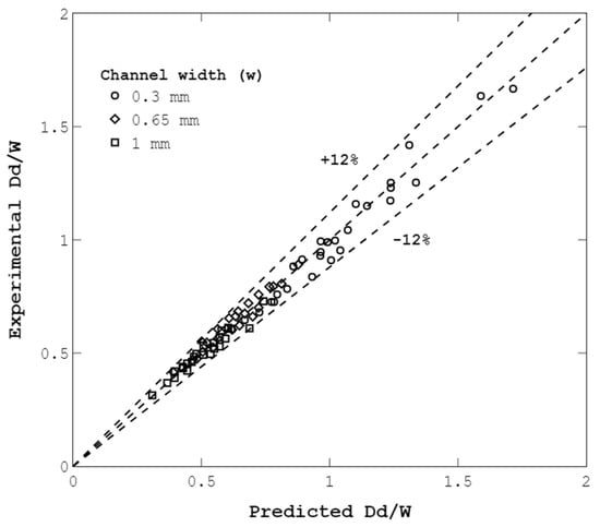 The final functional form for Equation (3) can be seen in Equation (4). The Fminsearch function of MATLAB software was utilized to find the fitting parameters based on the minimum root mean square error. This function uses the Nelder–Mead simplex algorithm to perform multidimensional unconstrained minimization [62]. Considering the results above, Equation (5) was found and can serve as an empirical model. Figure 14 shows that the proposed equation has an appropriate functional form; thus, the empirical model described by Equation (5) can be used for the prediction of droplet sizes in the proposed device.