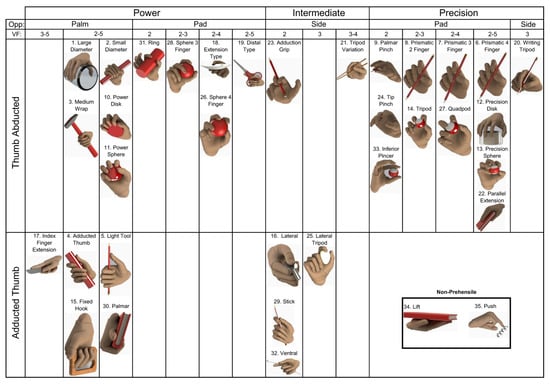 - Napier, J.R. The prehensile movements of the human hand. J. Bone Jt. Surgery Br. Vol. 1956, 38, 902–913. [Google Scholar] [CrossRef]