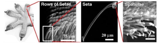 - Sikdar, S.; Rahman, M.H.; Siddaiah, A.; Menezes, P.L. Gecko-Inspired Adhesive Mechanisms and Adhesives for Robots—A Review. Robotics 2022, 11, 143. [Google Scholar] [CrossRef]