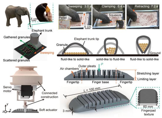 - Washio, S.; Gilday, K.; Iida, F. Design and Control of a Multi-Modal Soft Gripper Inspired by Elephant Fingers. In Proceedings of the 2022 IEEE/RSJ International Conference on Intelligent Robots and Systems (IROS), Kyoto, Japan, 23–27 October 2022; pp. 4228–4235. [Google Scholar]