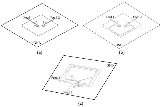 Structure of the proposed antenna. (a) Original patch; (b) with neutralization line; (c) with neutralization line and decoupling network.