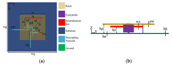 Layout of the proposed dual-polarized patch antenna (units: mm). (a) Top view; (b) side view.