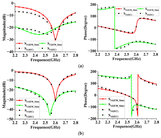 Comparison of S-parameters (magnitude and phase) of the EM structure and the equivalent circuit (EC) model. (a) Without I-NL; (b) with I-NL.