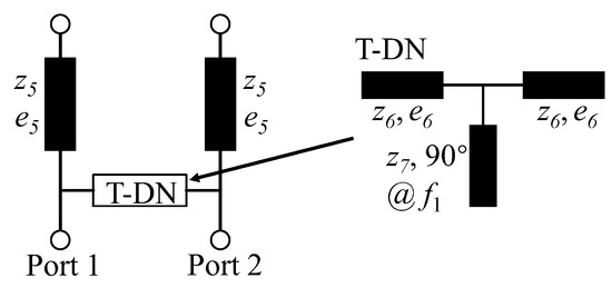 Figure 5 illustrates the schematic diagram of the proposed decoupling network, which comprises two sections of transmission lines (TLs) and a T-DN. As described in [12], the inserted TLs and T-DN serve to eliminate the real and imaginary parts of mutual admittance (by adjusting e5 and z6), respectively. A shunt quarter wavelength TL, evaluated at f1, is positioned at the center of the T-DN to maintain the first TZ created by I-NL. This approach enables the independent control of the position of two TZs, resulting in deep and wideband decoupling.