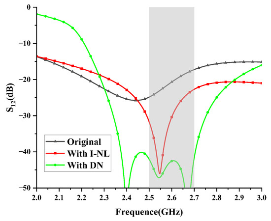 As shown in (5), the I-NL can provide another mutual coupling to cancel out the original coupling. By adjusting the length/width and height of I-NL (C3, L2, L4, z4, and e4), the first transmission zero can be created at f1.