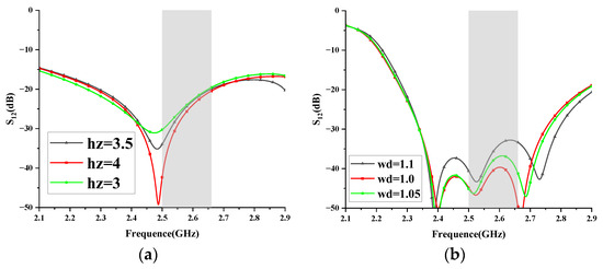 The I-NL and T-DN are responsible for generating the first and second TZ, respectively. To further investigate this, the height of I-NL (hz) and the width of the microstrip line of T-DN (wd) are used for examination. Figure 7 illustrates the variation in S-parameters when these two parameters are changed. Excellent decoupling performance is attained with hz = 3.5 mm and wd = 1.05 mm. By adjusting hz, the first TZ at a lower frequency can be generated. By adjusting wd, the second TZ can be generated without affecting the first TZ. This demonstrates the independent control of the two TZs.