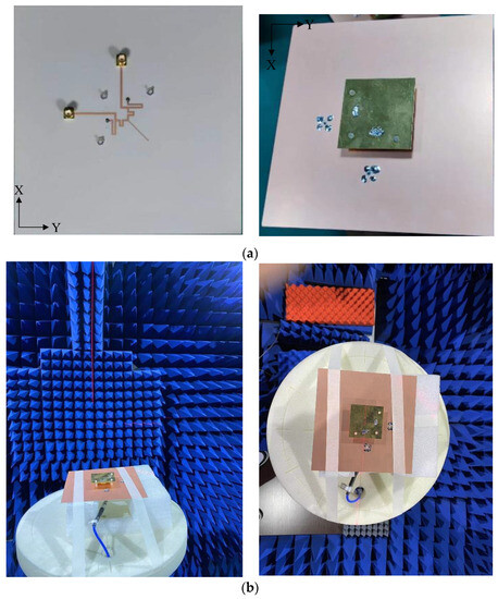 Photographs of the fabricated antenna and anechoic chamber. (a) The fabricated antenna; (b) the anechoic chamber.