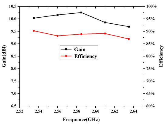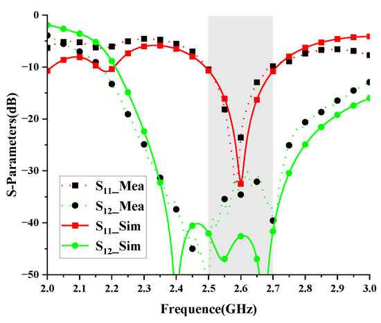 For verification, the proposed high-isolation dual-polarized patch antenna is designed, fabricated, and measured. Figure 8 shows the photographs of the fabricated antennas and the anechoic chamber. The suspended patch is supported by three plastic posts. The S-parameters are measured by the Keysight vector network analyzer E5071C, and radiation patterns are measured in an anechoic chamber. As shown in Figure 9, the measured reflection coefficient of the proposed antenna is below −10 dB from 2.5 to 2.7 GHz. High isolation (below 30 dB) is realized in the operating band by using the proposed decoupling method. Figure 10 shows the simulated and measured radiation patterns (yoz- and xoz-planes) of the proposed antenna. Good agreement of the simulated and measured results is observed. Figure 11 gives the measured total efficiency and realized antenna gain of the proposed antenna. High total efficiency (90%) and measured stable gain (9.6–10.3 dBi) is observed. Furthermore, the measured front-to-back ratio is about 23 dB.