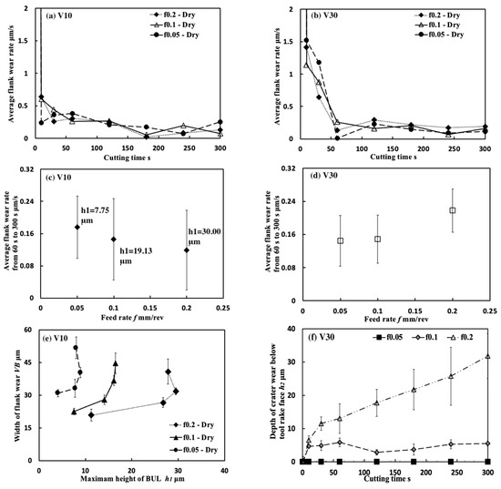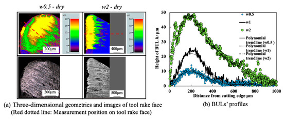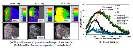 - The stability of the BUL is very high, and the BUL can not only significantly protect the tool from wear but also reduce friction at the tool–chip interface and maintain surface roughness. The height of the BUL can play a very important role in its protective effect, and a higher BUL can improve its protective effect. This indicates that we can realize the SPT when dry cutting Inconel 718 by actively and purposely utilizing the BUL and control the SPT by controlling the height of the BUL.