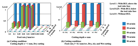 - The cutting speed plays a decisive role in the BUL formation condition. In most cases, the BUL only occurs in the cutting speed range of ~30 m/min, and this cutting speed range can increase to ~50 m/min or decrease to ~10 m/min depending on the cutting condition. The feed rate has a more significant influence on the BUL formation cutting speed range compared with the cutting depth and cutting atmosphere. And the cutting-edge radius has few or no influences on the BUL formation.