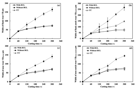 4.1. Comparison with the Results under Air and Wet Cutting Atmospheres