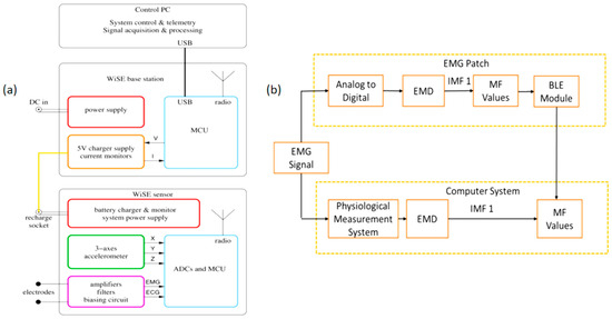The images of different EMG research and development ideas. (a) WiSE system block diagram. reprinted from [68], copyright (2018), with permission from SPRINGERLINK. (b) The framework of comparison between the real-time EMG patch and the offline computer system. Reprinted from [69], copyright (2019), with permission from MDPI.