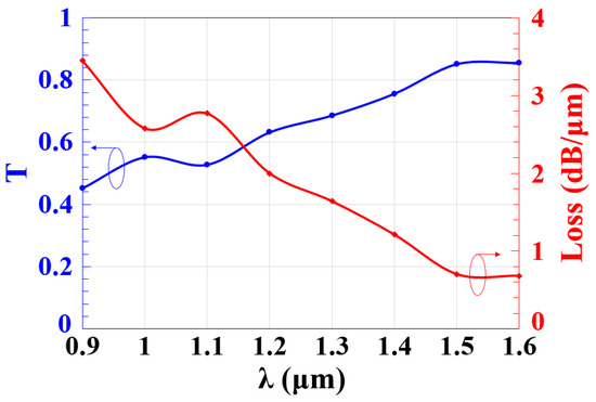 Normalized spectral transmission (T) and loss versus operating wavelength (λ) using the Ψ-shaped silicon waveguide.